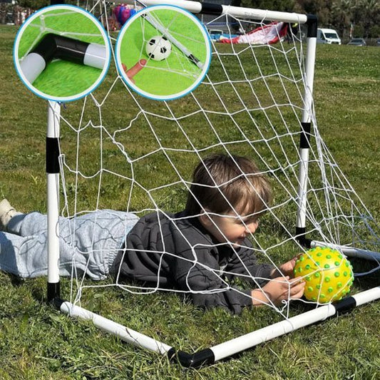 Notre Mini cage de foot enfant Maxigoal est livrée avec un ballon et une pompe, formant un kit complet pour débuter. Pour les plus petits espaces, notre Cage de foot Kitfoot inclut également un ballon et un gonfleur gratuit!