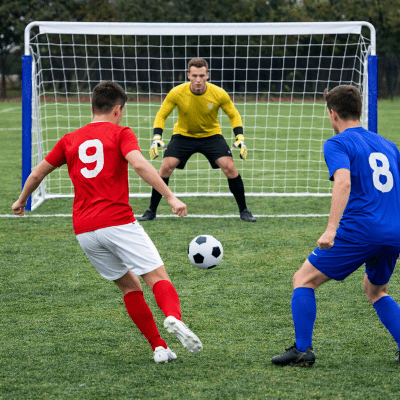 Pour les enfants, privilégiez des exercices ludiques et simples. Par exemple, compter le nombre de tirs réussis dans la cage de foot adaptée aux petits enfants , viser une zone précise ou tirer après un petit dribble. Une cage de foot enfant, légère et sécurisée, permet d’apprendre les bases du football tout en s’amusant et en développant coordination et motricité.